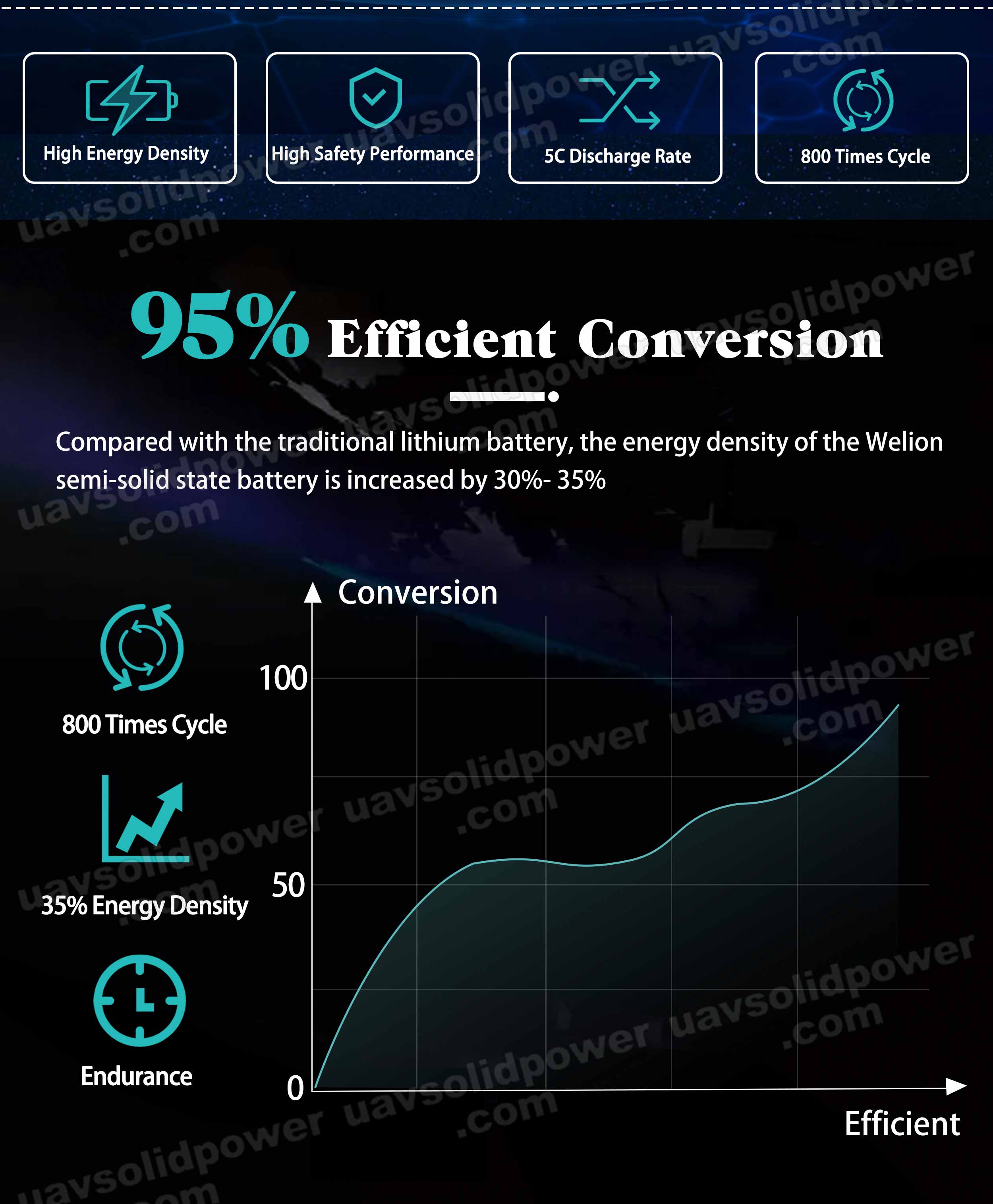 High energy density. The energy density is 30%-35% higher, even 20% higher than the high-voltage version of lithium-ion. Long endurance, 20%-35% more endurance than traditional batteries.